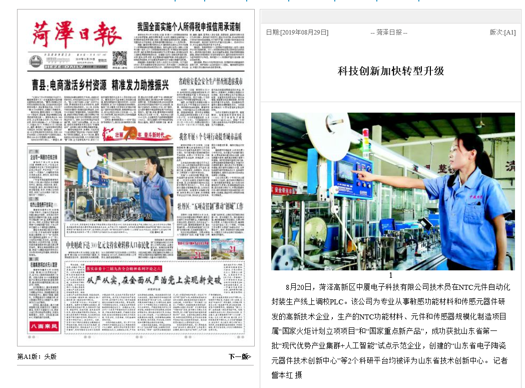 2019年8月29日《菏澤日報》報道:“科技創(chuàng)新加快轉型升級”。中廈電子科技有限...
